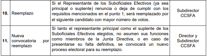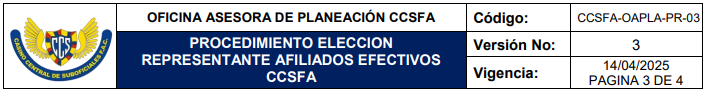 La presente información es para notificar que mediante la Junta Directiva Ordinaria 002-2025 que se llevo a cabo el día 29 de mayo de 2025 donde se dio a conocer la actualización del procedimiento CCSFA-OAPLA-PR-03 PROCEDIMIENTO ELECCION REPRESENTANTE AFILIADOS EFECTIVOS CCSFA, el cual no contemplaba esta situación presentada que alguno de los elegidos renunciara a su nombramiento, se actualizo y se dio a conocer en la junta.